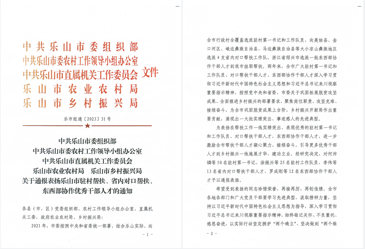 根據(jù)(樂市組通【2023】31號)文件精神,中共樂山市委組織部、中共樂山市委農(nóng)村工作領(lǐng)導(dǎo)小組辦公室等6單位發(fā)文對全市50名駐村第一書記、25名駐村工作隊員、13名省內(nèi)對口幫扶干部人才、12名東西部協(xié)作干部人才進行通報表揚,我公司駐峨邊縣沙坪鎮(zhèn)河溝村工作隊員王德波同志榜上有名、被予表揚。