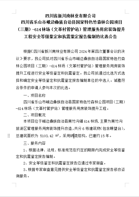 四川省新川南林業(yè)有限公司614林場(文革村管護(hù)站)管理服務(wù)用房裝飾提升工程安全等級鑒定和抗震鑒定報(bào)告編制的比選公告