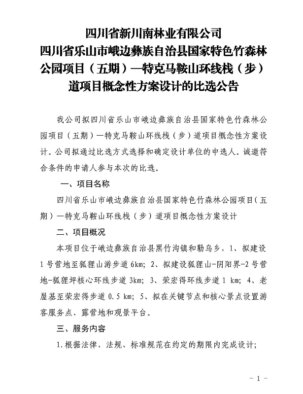 四川省新川南林業(yè)有限公司四川省樂(lè)山市峨邊彝族自治縣國(guó)家特色竹森林公園項(xiàng)目(五期)—特克馬鞍山環(huán)線(xiàn)棧(步)道項(xiàng)目概念性方案設(shè)計(jì)的比選公告