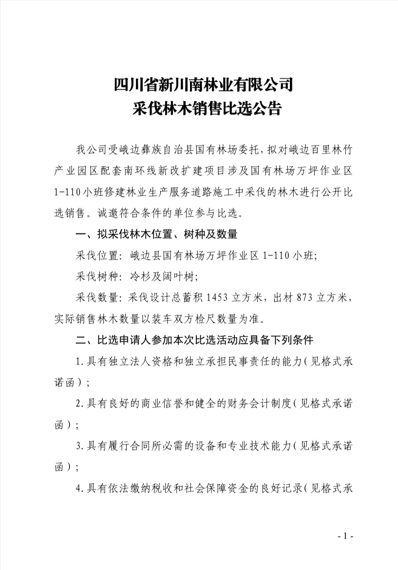 四川省新川南林業(yè)有限公司采伐林木銷售比選公告